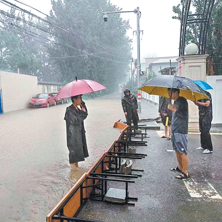 西区东门外,住户们铺沙袋立桌面精明雨水倒灌。